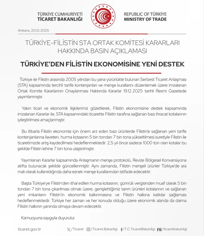 Bu kapsamda, Filistin ekonomisi açısından büyük önem taşıyan ürünlerde yeni tarife kontenjanları tanımlanırken, Türkiye'ye gümrük vergisinden muaf olarak ithal edilen Filistin menşeli hurmanın kotası 5 bin tondan 7 bin tona yükseltildi. Açıklamada, 2,5 yıl önce yalnızca 1.000 ton olan hurma kotasının bu düzenlemeyle Filistin lehine önemli ölçüde artırıldığı vurgulandı.