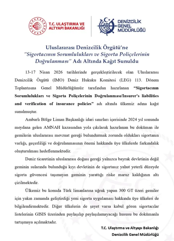 ANKARA (İGFA) - T.C. Ulaştırma ve Altyapı Bakanlığı Denizcilik Genel Müdürlüğü, Uluslararası Denizcilik Örgütü (IMO) nezdinde deniz güvenliğini yakından ilgilendiren önemli bir çalışmaya imza attı. Denizcilik Genel Müdürlüğü tarafından hazırlanan ve IMO Deniz Hukuku Komitesi'nin (LEG) 13-17 Nisan 2026 tarihleri arasında gerçekleştirilecek 113. Dönem Toplantısı'na sunulacak çalışma, "Sigortacının Sorumlulukları ve Sigorta Poliçelerinin Doğrulanması" başlığını taşıyor.