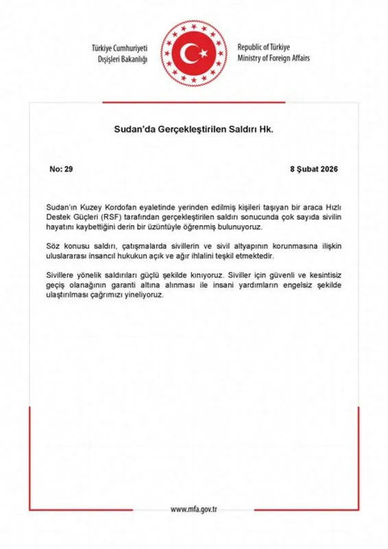 Dışişleri Bakanlığı, Sudan'ın Kuzey Kordofan eyaletinde yerinden edilmiş sivilleri taşıyan bir araca yönelik saldırıyı kınayarak, uluslararası insancıl hukukun açıkça ihlal edildiğini vurguladı.