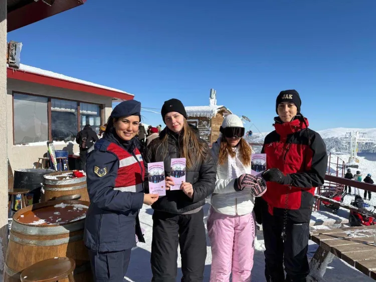 Bursa İl Jandarma Komutanlığı, Uludağ Milli Parkı'nda kış turizmi için bulunan vatandaşlara Kadın Acil Destek Uygulaması (KADES) hakkında bilgilendirme çalışması gerçekleştirdi.