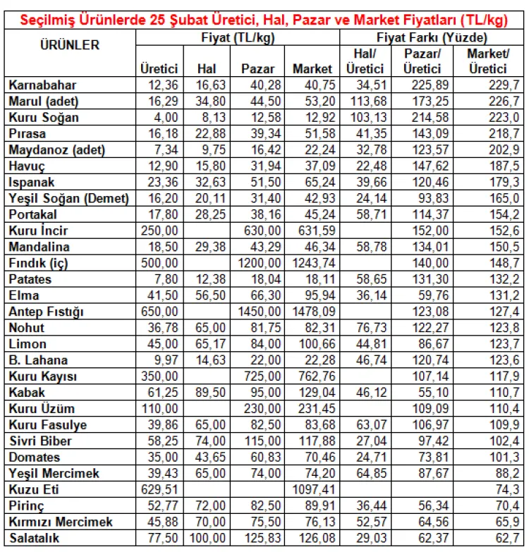 Üreticide 12,36 TL olan karnabahar markette 40,75 TL'ye satıldı. Marulda üretici fiyatı 16,29 TL iken market fiyatı 53,20 TL'ye ulaştı.