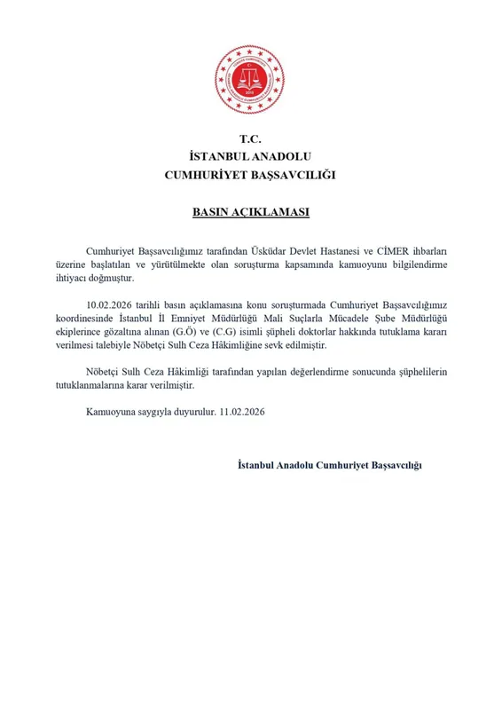 İstanbul Anadolu Cumhuriyet Başsavcılığı, Üsküdar Devlet Hastanesi ve CİMER'e yapılan ihbarlar üzerine başlatılan soruşturma kapsamında gözaltına alınan iki doktorun tutuklandığını açıkladı.