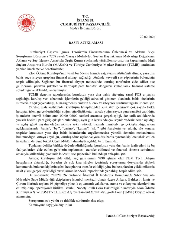 İSTANBUL (İGFA) - İstanbul Cumhuriyet Başsavcılığı Terörizmin Finansmanının Önlenmesi ve Aklama Suçu Soruşturma Bürosu tarafından yürütülen soruşturma kapsamında, Mali Suçları Araştırma Kurulu (MASAK) ve Türkiye Cumhuriyet Merkez Bankası (TCMB) denetimlerinde, Klon Ödeme Kuruluşu'nun yasal bir ödeme hizmeti sağlayıcısı görünümü altında yasa dışı bahis gruplarına finansal altyapı sağladığı belirlendi.