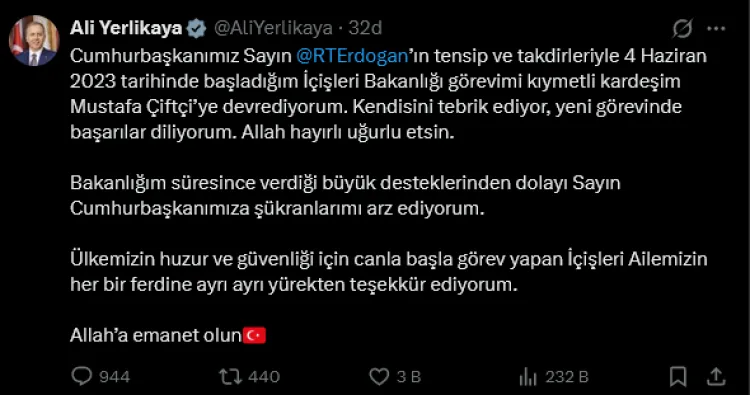 Cumhurbaşkanı Erdoğan imzasıyla Resmi Gazete'de yayımlanan atama kararıyla İçişleri Bakanlığı görevini Mustafa Çiftçi'ye devredecek olan Ali Yerlikaya, paylaşımında Cumhurbaşkanı Recep Tayyip Erdoğan'ın tensipleriyle 4 Haziran 2023'te başladığı görevini devrettiğini belirterek, "Kıymetli kardeşim Mustafa Çiftçi'yi tebrik ediyor, yeni görevinde başarılar diliyorum" ifadelerini kullandı. Yerlikaya, görev süresi boyunca verdiği desteklerden dolayı Cumhurbaşkanı Erdoğan'a teşekkür ederken, İçişleri Bakanlığı teşkilatının tüm mensuplarına da şükranlarını sundu.