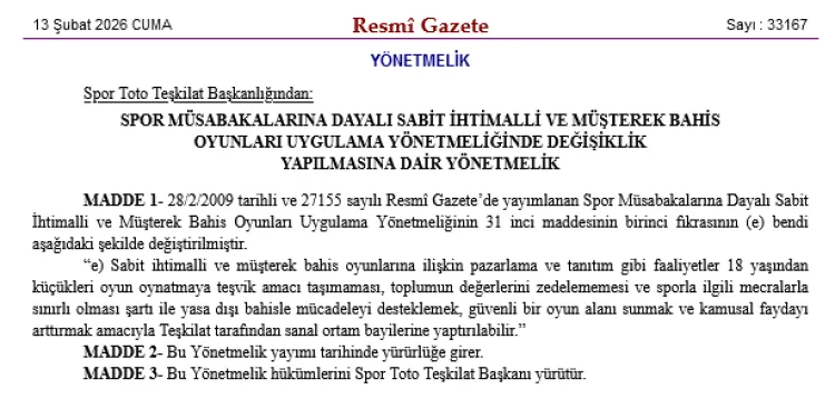 Resmi Gazete'de yayımlanan yönetmelik değişikliğiyle Spor Toto'nun sabit ihtimalli ve müşterek bahis oyunlarının pazarlama ve tanıtım faaliyetlerinde 18 yaş altı hedef alınmayacak ve tanıtım sadece spor mecralarıyla sınırlandırılacak.