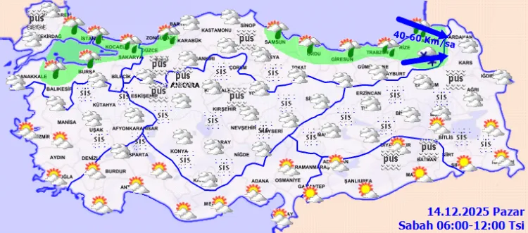 Meteoroloji, 14 Aralık'ta Türkiye genelinde parçalı bulutlu hava ve bazı bölgelerde yağış uyarısı yaptı. Marmara, Karadeniz kıyıları, Batı Karadeniz, Yozgat, Antalya, Sivas çevresinde yağmur, yükseklerde kar bekleniyor. Rüzgar, kuzeyli yönlerden esecek.
