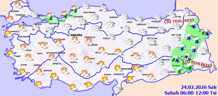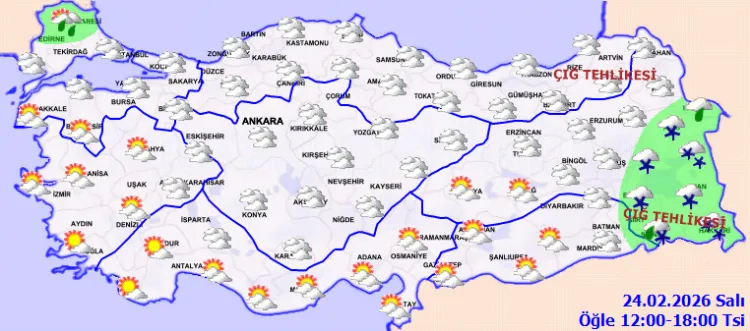 Meteoroloji Genel Müdürlüğü verilerine göre yurdun büyük bölümünde yağış beklenirken, Doğu Karadeniz ve Doğu Anadolu'da çığ ve kar erimesi tehlikesine karşı uyarı yapıldı. Hava sıcaklıkları ise mevsim normallerinin üzerinde seyredecek.