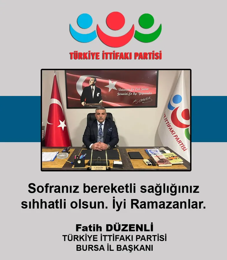 Türkiye İttifakı Partisi Bursa İl Başkanı Fatih Düzenli, mesajının sonunda Bursalı hemşehrilerinin ve tüm İslam âleminin Ramazan ayını tebrik ederek, bu mübarek ayın hayırlara vesile olmasını diledi.