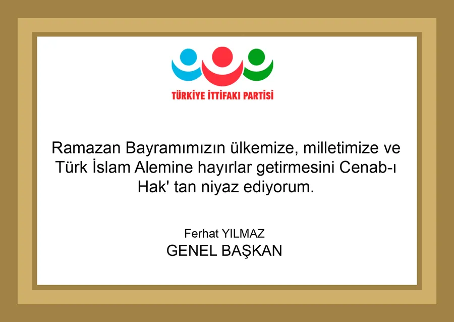 Türkiye İttifakı Partisi Genel Başkanı Ferhat Yılmaz, mesajının sonunda ise şu ifadelere yer verdi: “Ramazan Bayramımızın ülkemize, milletimize ve Türk İslam âlemine hayırlar getirmesini Cenab-ı Hak’tan niyaz ediyorum.”