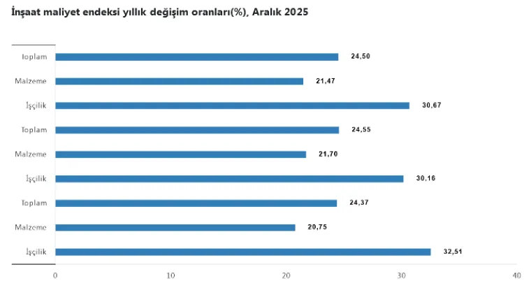 TÜİK verilerine göre, Aralık 2025'te inşaat maliyet endeksi yıllık yüzde 24,5 artışla yükseldi. Malzeme ve işçilik maliyetlerindeki artış, özellikle işçilik payının yüksek olduğu bina inşaatlarında dikkat çekti. Veriler, hem malzeme, hem de işçilik maliyetlerinin yıllık bazda yüksek artış gösterdiğini ortaya koydu.