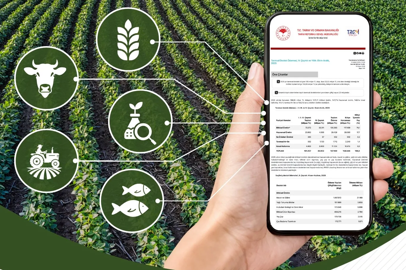 Tarım ve Orman Bakanlığı, 2025 yılı tarımsal destek ödemelerini açıkladı. Toplam 158,55 milyar TL'lik bütçenin tamamı kullanılırken, 2,9 milyon çiftçi çeşitli desteklerden yararlandı.
