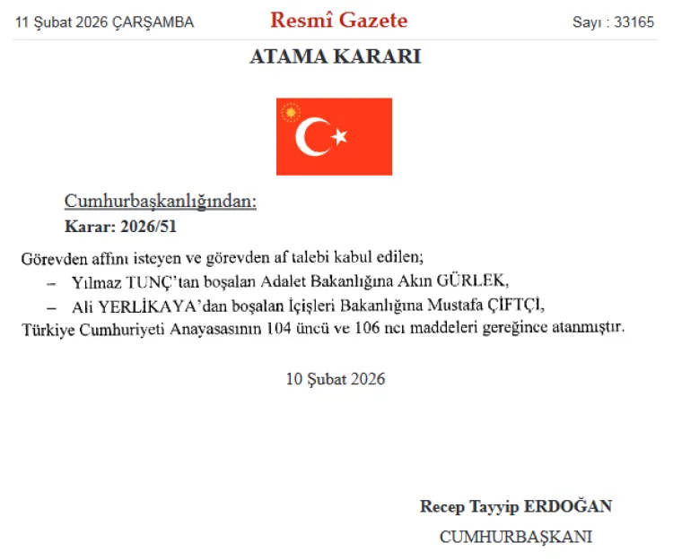 Cumhurbaşkanı Recep Tayyip Erdoğan'ın imzasıyla yayımlanan kararla Adalet ve İçişleri Bakanlıklarında görev değişimi yapıldı.
