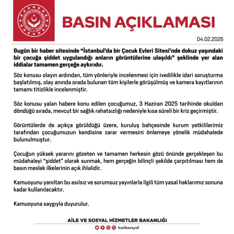 Aile ve Sosyal Hizmetler Bakanlığı, İstanbul'daki bir Çocuk Evleri Sitesi'nde 9 yaşındaki bir çocuğa şiddet uygulandığına dair haberlerin gerçeği yansıtmadığını açıkladı. Bakanlık, görüntülerde yer alan müdahalenin çocuğun kendisine zarar vermesini önlemeye yönelik olduğunu bildirdi.