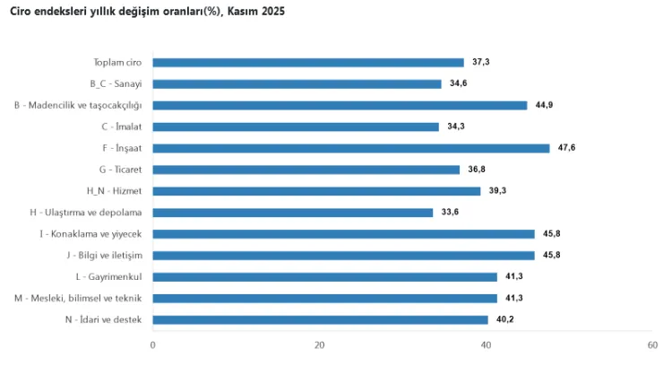 TÜİK verilerine göre sanayi, inşaat, ticaret ve hizmet sektörlerini kapsayan toplam ciro endeksi, 2025 yılı Kasım ayında yıllık bazda yüzde 37,3, aylık bazda ise yüzde 3,7 artış gösterdi. Veriler, Kasım'da tüm ana sektörlerde ciro artışının devam ettiğini ortaya koydu.