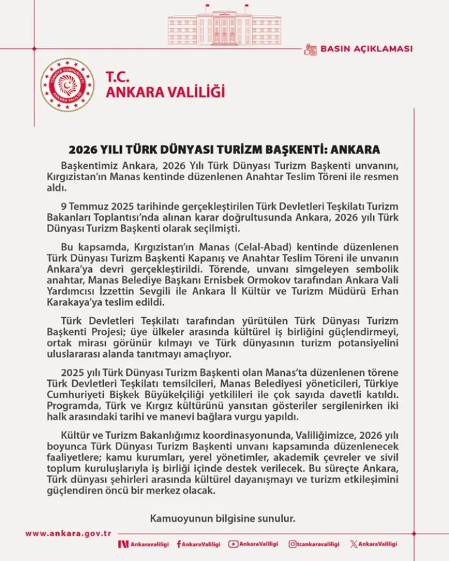 Cumhuriyetin başkenti Ankara, Türk Devletleri Teşkilatı kararıyla 2026 yılı "Türk Dünyası Turizm Başkenti" oldu. Unvan, Kırgızistan'ın Manas kentinde düzenlenen törenle Ankara'ya teslim edildi.
