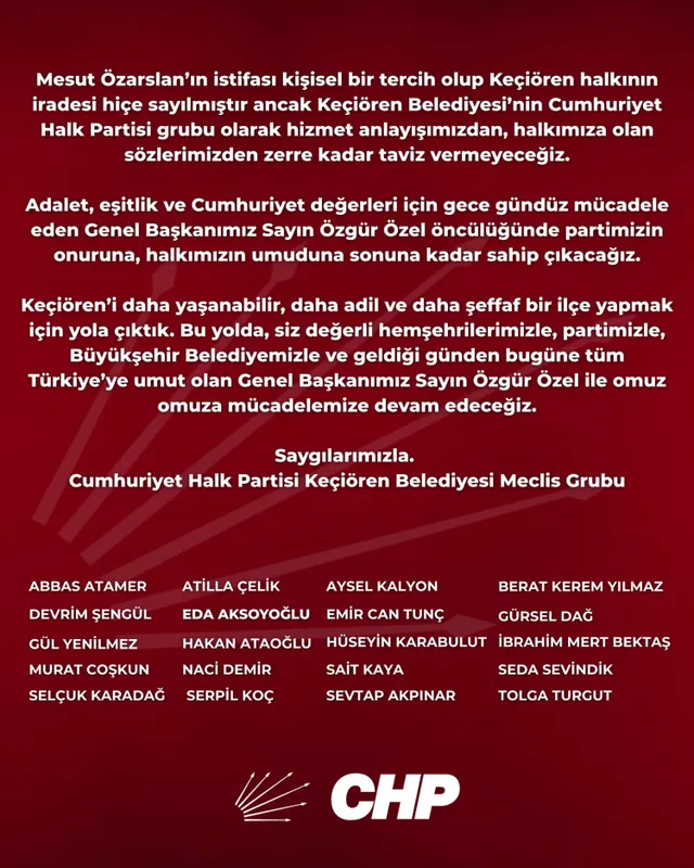 CHP Meclis Grubu, belediyede hizmet anlayışından ve halkla verilen sözlerden taviz vermeyeceklerini ifade ederek, "Keçiören'i daha yaşanabilir, daha adil ve daha şeffaf bir ilçe yapmak için partimiz, Büyükşehir Belediyemiz ve Genel Başkanımız Özgür Özel ile omuz omuza mücadelemize devam edeceğiz" ifadelerini kullandı.