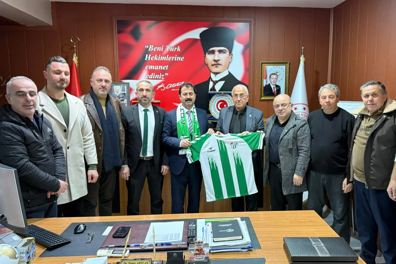 Sıcak ve samimi bir ortamda gerçekleşen ziyarette, İl Müdürü Yunuz Arslan'a isminin yazılı olduğu forma ile atkı takdim edildi.