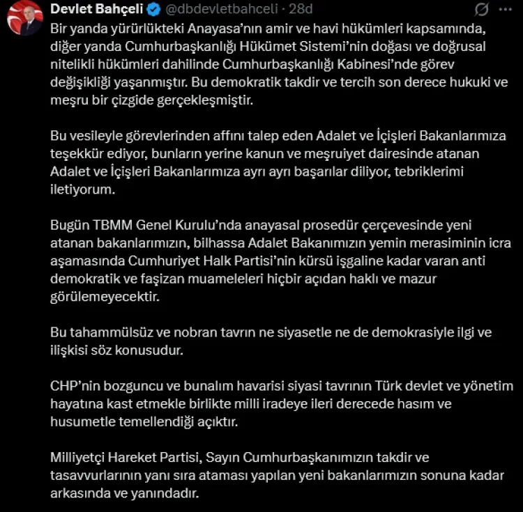 MHP Genel Başkanı Devlet Bahçeli, Cumhurbaşkanlığı Kabinesi'nde yapılan görev değişikliklerinin hukuki ve meşru olduğunu belirterek, TBMM Genel Kurulu'nda yeni bakanların yemin töreni sırasında yaşanan gerginlik nedeniyle CHP'yi sert sözlerle eleştirdi.