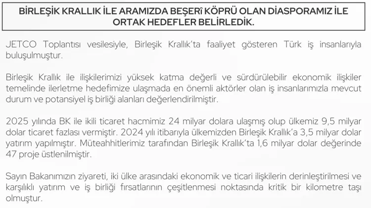 Türkiye ve İngiltere arasında 2021'den bu yana uygulanan serbest ticaret anlaşmasının ikili ticareti son 4 yılda yaklaşık 5 milyar dolar artırdığını aktaran Bolat, geçen yıl ticaret hacminin 24 milyar dolara ulaştığını, hedeflerinin kısa vadede 30, orta vadede ise 40 milyar dolar olduğunu söyledi. Bakan Bolat ayrıca, serbest ticaret anlaşmasının genişletilmesi için müzakerelerin sürdüğünü ve dördüncü turun Şubat ayında yapılacağını açıkladı.