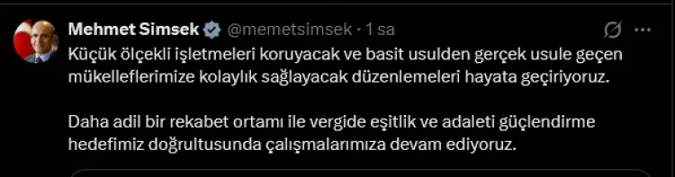 1 Ocak 2026 tarihinden itibaren geçerli olacak kararla ilgili Hazine ve Maliye Bakanı Mehmet Şimşek de, sosyal medya hesabından yaptığı paylaşımda, "Küçük ölçekli işletmeleri koruyacak ve basit usulden gerçek usule geçen mükelleflerimize kolaylık sağlayacak düzenlemeleri hayata geçiriyoruz. Daha adil bir rekabet ortamı ile vergide eşitlik ve adaleti güçlendirme hedefimiz doğrultusunda çalışmalarımıza devam ediyoruz" ifadelerini kullandı.