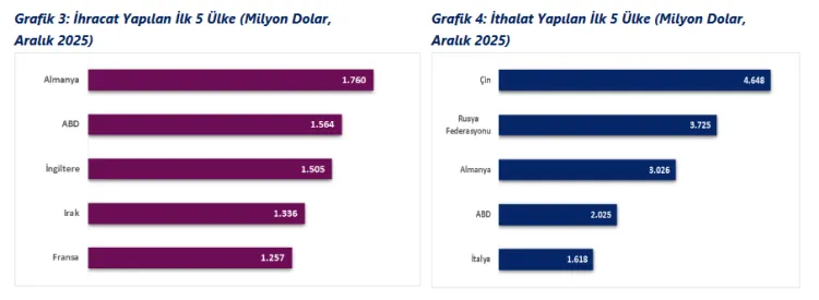 Verilere göre ihracat yapılan ilk 5 ülkede Almanya başı çekerken, ithalat yapılan ilk 5 ülke arasında Çin yer aldı.