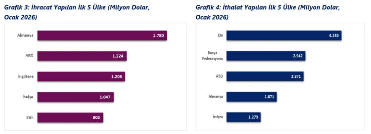 Ocak ayında ihracatta en fazla paya sahip ülke grupları; Avrupa Birliği (AB-27) 8 milyar 776 milyon dolar, Yakın ve Orta Doğu ülkeleri 3 milyar 422 milyon dolar ve Diğer Avrupa ülkeleri 2 milyar 897 milyon dolar olarak sıralandı. İthalatta ise Asya ülkeleri 8 milyar 139 milyon dolarla ilk sırada yer alırken, AB-27 7 milyar 430 milyon dolar ile ikinci sırada geldi.