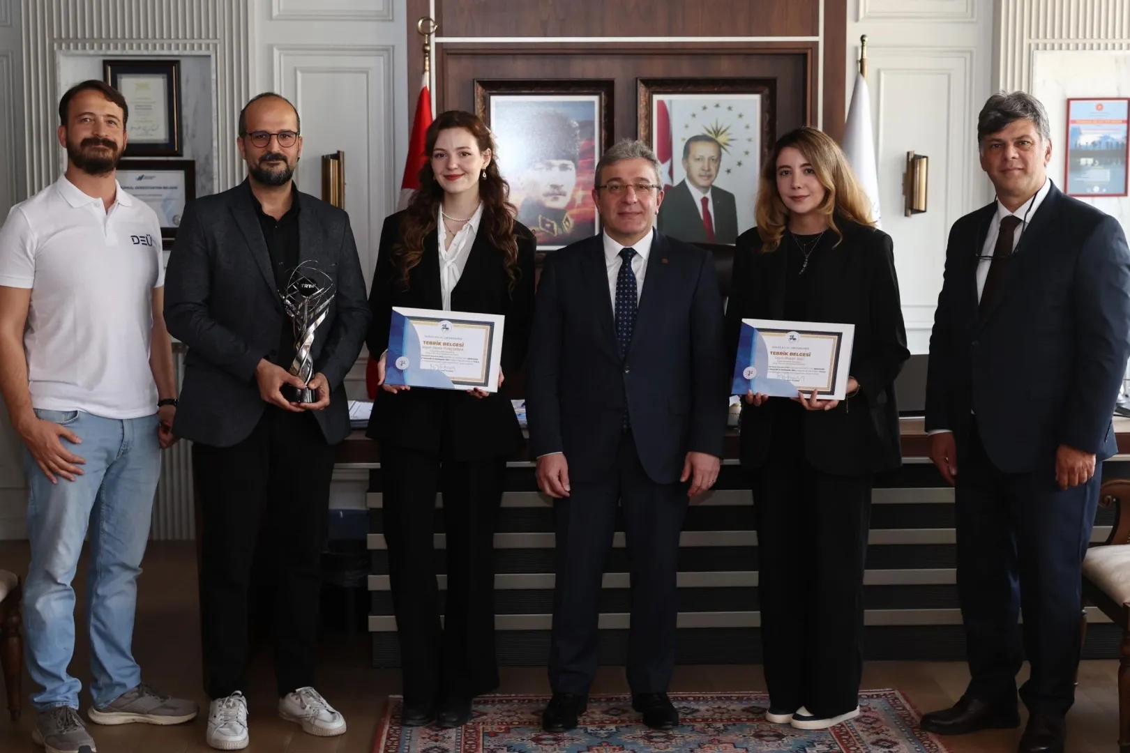 Başarının ardından GSF Dekan Vekili Prof. Dr. Serdar Aybek, Bölüm Başkanı Doç. Dr. Çağdaş Ülgen, proje danışmanı Dr. Öğr. Üyesi Memet Ali Zeren ve ödül sahibi öğrenciler, DEÜ Rektörü Prof. Dr. Bayram Yılmaz'ı makamında ziyaret etti. Rektör Yılmaz, öğrencilere başarı belgelerini takdim ederek tebriklerini iletti.