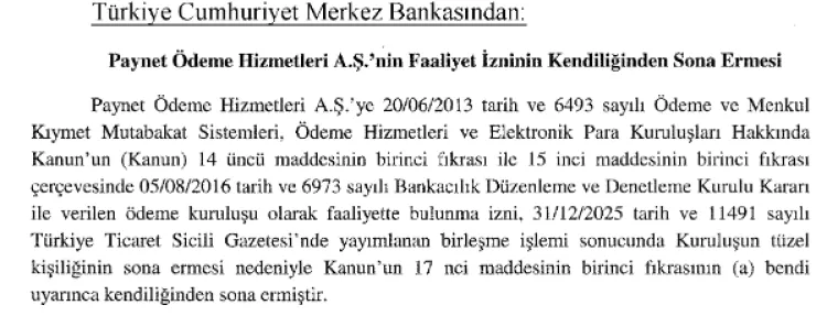 Paynet Ödeme Hizmetleri A.Ş.'nin faaliyet izni ise kendiliğinden sona erdi. Sona erme gerekçesi, 31 Aralık 2025 tarihli Ticaret Sicil Gazetesi'nde yayımlanan birleşme işleminden dolayı olduğu belirtildi.