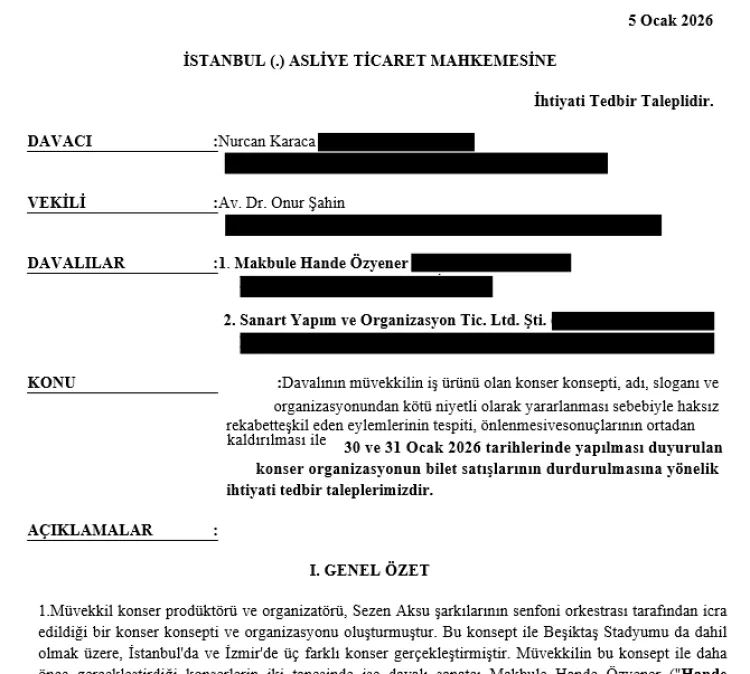 İSTANBUL (İGFA) - 2024 yılında seyirciyle buluşan ve tüm oluşum süreci ile fikri altyapısı Nurcan Karaca'ya ait olan "Hande Bizi Sezen'e Götür! Senfonik" projesiyle ilgili hukuki süreç başlatıldı. Projenin yapımcısı NK Projeler, aynı başlık ve konseptin izin alınmaksızın kullanılarak bilet satışına açılması üzerine yorumcu Hande Yener ve organizasyonu düzenleyen firmaya karşı dava açtıklarını kamuoyuna duyurdu.