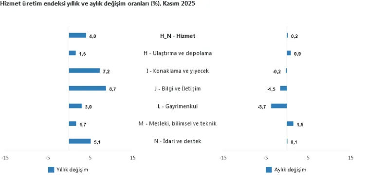 Hizmet üretim endeksi 2025 yılı Kasım ayında yıllık yüzde 4,0 artarken, aylık bazda yüzde 0,2 yükseldi. Veriler, yıllık bazda büyümenin sürdüğünü, ancak aylık bazda sektörler arasında dalgalı bir seyir izlendiğini ortaya koydu. Aylıkta en çok azalan hizmet gayrimenkul olurken, yıllık bazda en çok artış bilgi ve iletişim hizmetlerinde kaydedildi.