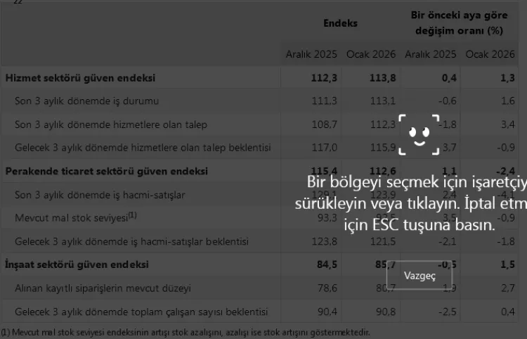 Türkiye İstatistik Kurumu (TÜİK), 2026 yılının ilk ayına ilişkin Hizmet, Perakende Ticaret ve İnşaat Güven Endekslerini yayımladı. Ocak ayında hizmet ve inşaat sektörlerinde güven artarken, perakende ticaret sektöründe düşüş yaşandı.