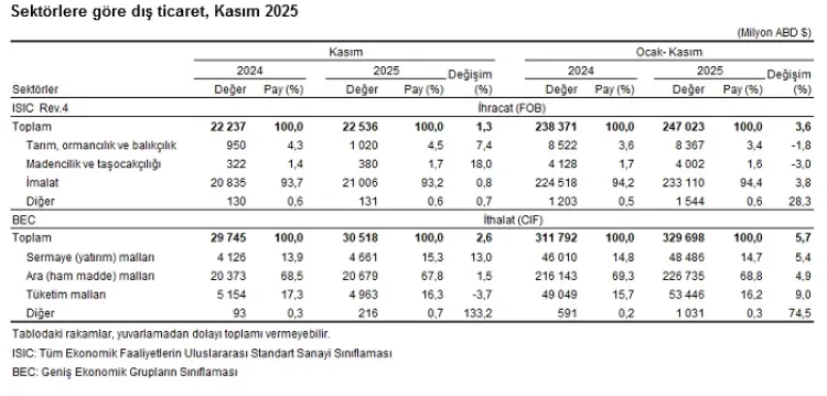 2025 yılının Ocak-Kasım döneminde ihracat yüzde 3,6 artışla 247 milyar 23 milyon dolar, ithalat ise yüzde 5,7 artarak 329 milyar 698 milyon dolar olarak gerçekleşti. Aynı dönemde dış ticaret açığı yüzde 12,6 artarak 82 milyar 674 milyon dolara çıktı.