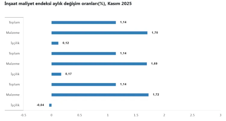 Bina inşaatı maliyet endeksi Kasım ayında aylık yüzde 1,14, yıllık yüzde 23,50 arttı. Aylık bazda malzeme endeksi yüzde 1,69, işçilik endeksi yüzde 0,17 yükselirken; yıllık bazda malzeme maliyetleri yüzde 20,03, işçilik maliyetleri ise yüzde 30,37 artış kaydetti.