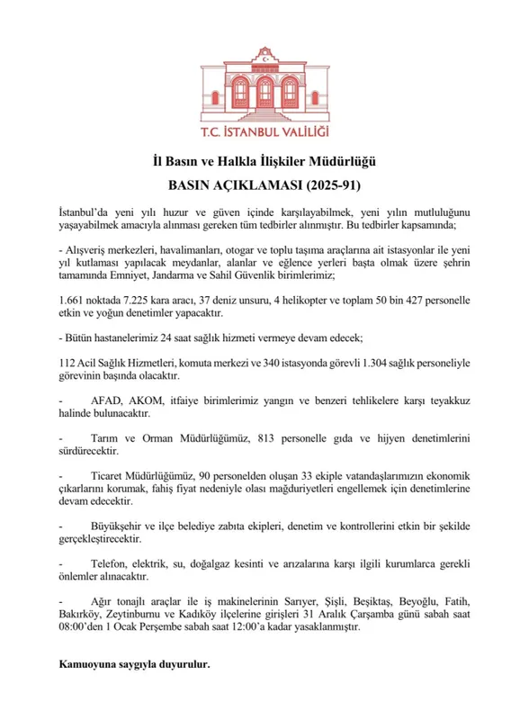 İstanbul Valiliği, yeni yılı huzur ve güven içinde karşılamak için şehir genelinde kapsamlı denetim ve önlemlerin alındığını açıkladı. Emniyet, Jandarma, Sahil Güvenlik ve sağlık birimleri yoğun şekilde görev yapacak.