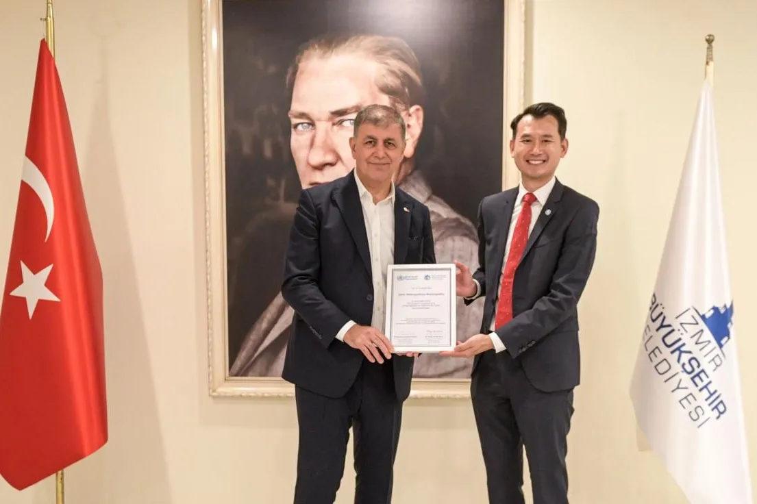 Yongjie Yon, Başkan Tugay'a Yaşlı Dostu Şehirler ve Topluluklar Küresel Ağı sertifikasını takdim etti. Programda Türkiye'den ağa üye olan iki büyükşehirden biri olma özelliğini taşıyan İzmir Büyükşehir Belediyesi'nin, ileri yaşlı bireylere yönelik hizmetleri ile öne çıktığına dikkat çekildi. Toplantıya İzmir Büyükşehir Belediyesi Genel Sekreter Yardımcısı Prof. Dr. Pınar Okyay ve Sağlık İşleri Dairesi Başkanı Ahmet Soner Emre, Dünya Sağlık Örgütü Türkiye Ofisi Halk Sağlığı Uzmanı Doç. Dr. Tufan Nayır da katıldı.