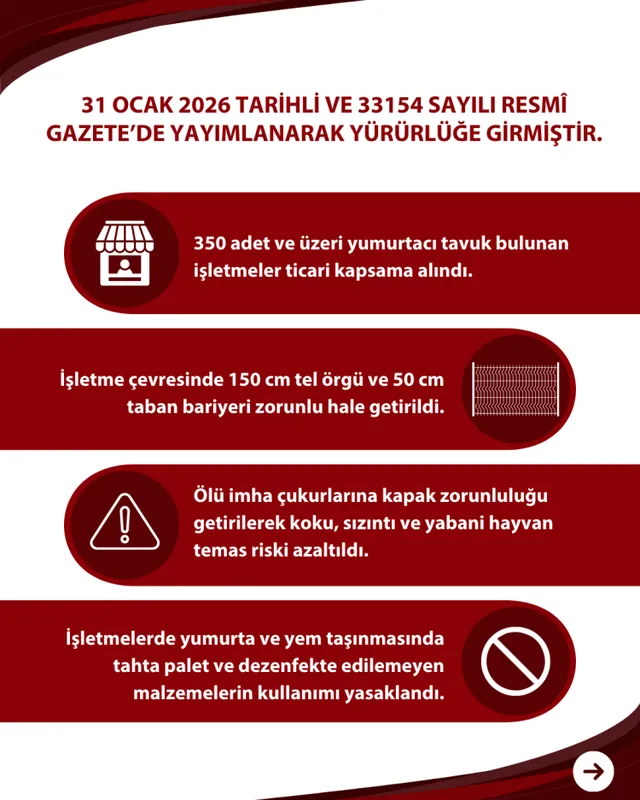 Tarım ve Orman Bakanlığı, ticari etlik ve yumurtacı kanatlı işletmelerinde biyogüvenliğin güçlendirilmesi amacıyla yeni tebliği yürürlüğe aldı. Düzenleme ile hastalık riskleri azaltılacak, denetimler daha etkin hâle gelecek.