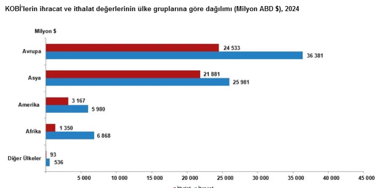 KOBİ'ler, 2024 yılında toplam ihracatın yüzde 29,6'sını, ithalatın ise yüzde 15,9'unu gerçekleştirdi. İhracatta mikro girişimler yüzde 2,4, küçük girişimler yüzde 10,7, orta ölçekli girişimler yüzde 16,5 pay alırken, KOBİ ihracatının yüzde 59,4'ü ticaret, yüzde 34,3'ü imalat sanayi ürünlerinden oluştu. İthalatta ise KOBİ'lerin payı yüzde 65,6 ticaret, yüzde 25,8 sanayi olarak belirlendi.