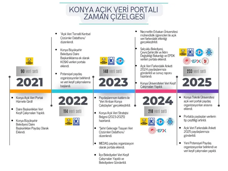 Bugün itibarıyla Konya Açık Veri Portalı, 20 paydaş kurum ve 230'un üzerinde veri seti ile hizmet veriyor. Çevre, Şehircilik ve İklim Değişikliği Bakanlığı, Konya Büyükşehir Belediyesi daire başkanlıkları, KOSKİ, Selçuklu Belediyesi, MEDAŞ, EPDK ve Konya Teknik Üniversitesi'nin ekosisteme dahil olmasıyla birlikte portalın kurumsal yapısı daha da güçlendi.