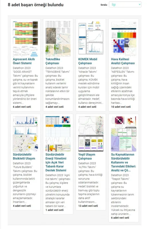 Açık veri tabanlı inovasyonu teşvik etmek amacıyla düzenlenen Datathon yarışmaları, yaratıcı proje fikirlerinin ve veri analizlerinin ortaya çıkmasına olanak tanıyor. Bu çalışmalar, portalda "Başarılı Örnekler" başlığı altında paylaşılarak açık verinin somut faydalarının daha geniş kitlelere ulaşmasını sağlıyor.