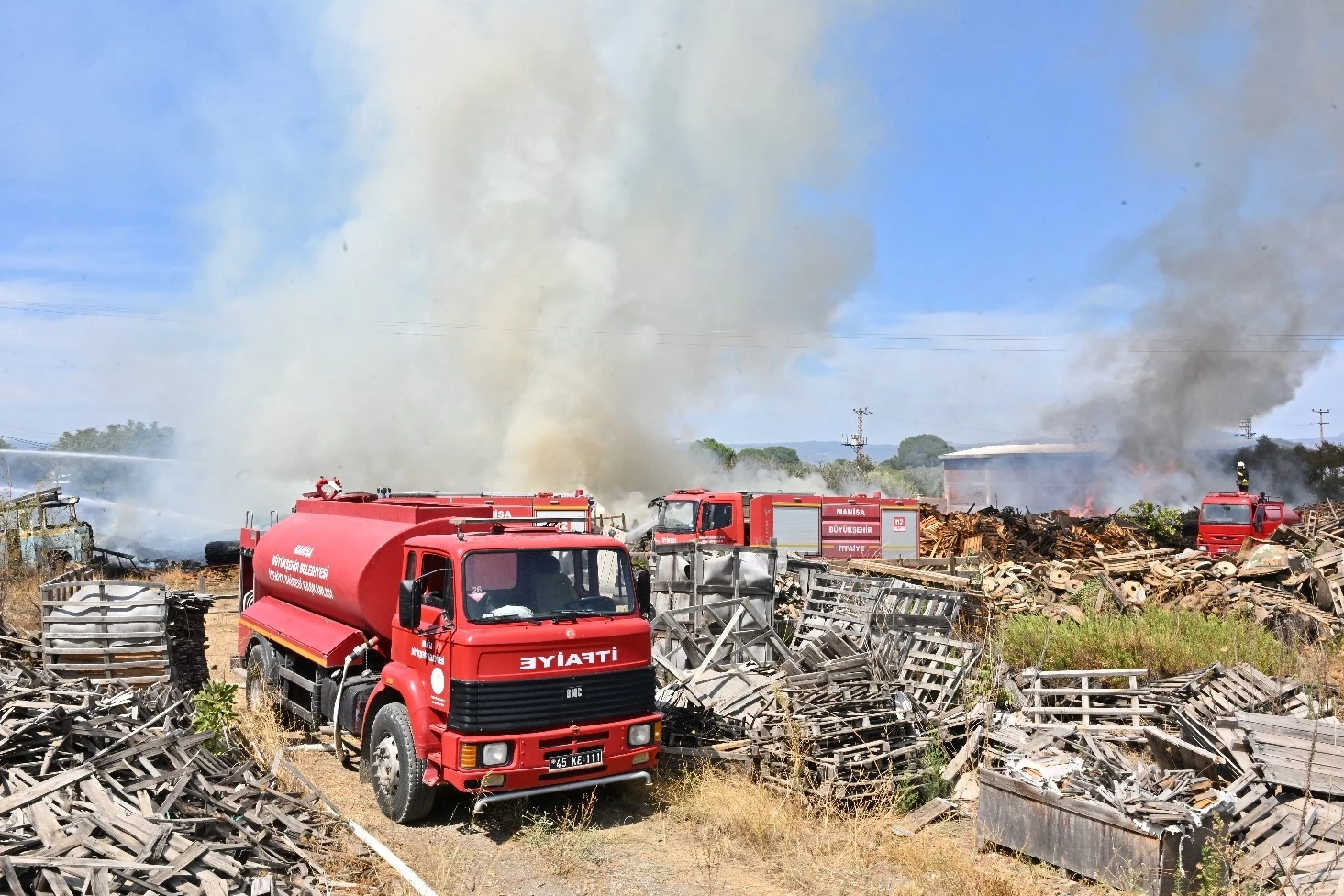 MANİSA (İGFA) - Manisa Büyükşehir Belediyesi İtfaiye Dairesi Başkanlığı ekipleri, Muradiye Mahallesi'ndeki ahşap palet fabrikasının depo alanında çıkan yangına müdahale edildi.