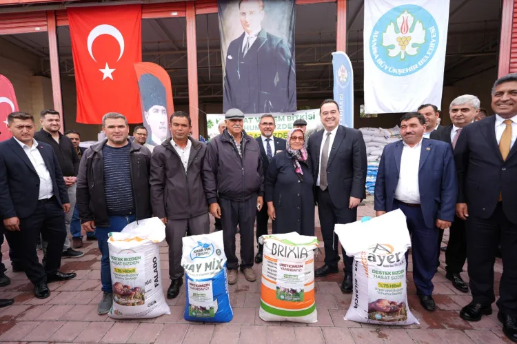 Manisa Büyükşehir Belediyesi, üreticiye destek projeleri kapsamında, yüzde 75 hibeli olarak bin 397 üreticiye 216 bin kilogram buğday, 188 bin kilogram arpa tohumu dağıtımında bulundu. Yüzde 75 hibe destekli Yem Bitkisi ve Süt Tohumu Bizden, Hasat Sizden Projesi ile de 114 bin 500 kilogram 5'li karışım yem bitkisi tohumu, 5 bin 925 kilogram süt otu tohumu desteğinde bulunuldu. Meyve üreticilerine yönelik olarak ise yüzde yüz hibeli olarak, bin 999 üreticiye 24 bin 700 litre sıvı gübre ve 3 bin 432 litre aminoasit desteği verilmeye başlandı.