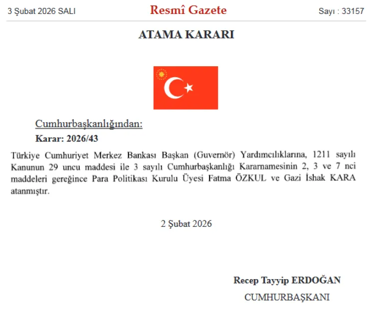 Buna göre Para Politikası Kurulu Üyesi Fatma Özkul ile Gazi İshak Kara, Merkez Bankası Başkan Yardımcılıklarına atandı.