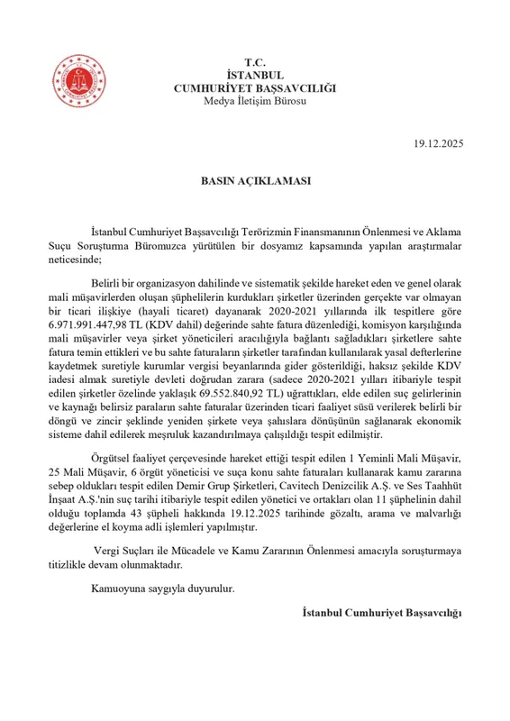 İstanbul Cumhuriyet Başsavcılığı tarafından yürütülen soruşturma kapsamında, 2020–2021 yıllarında hayali ticaret yoluyla yaklaşık 7 milyar liralık sahte fatura düzenlendiği belirlendi. Aralarında yeminli ve serbest mali müşavirlerin de bulunduğu 43 şüpheli hakkında gözaltı, arama ve mal varlığına el koyma kararı verildi.