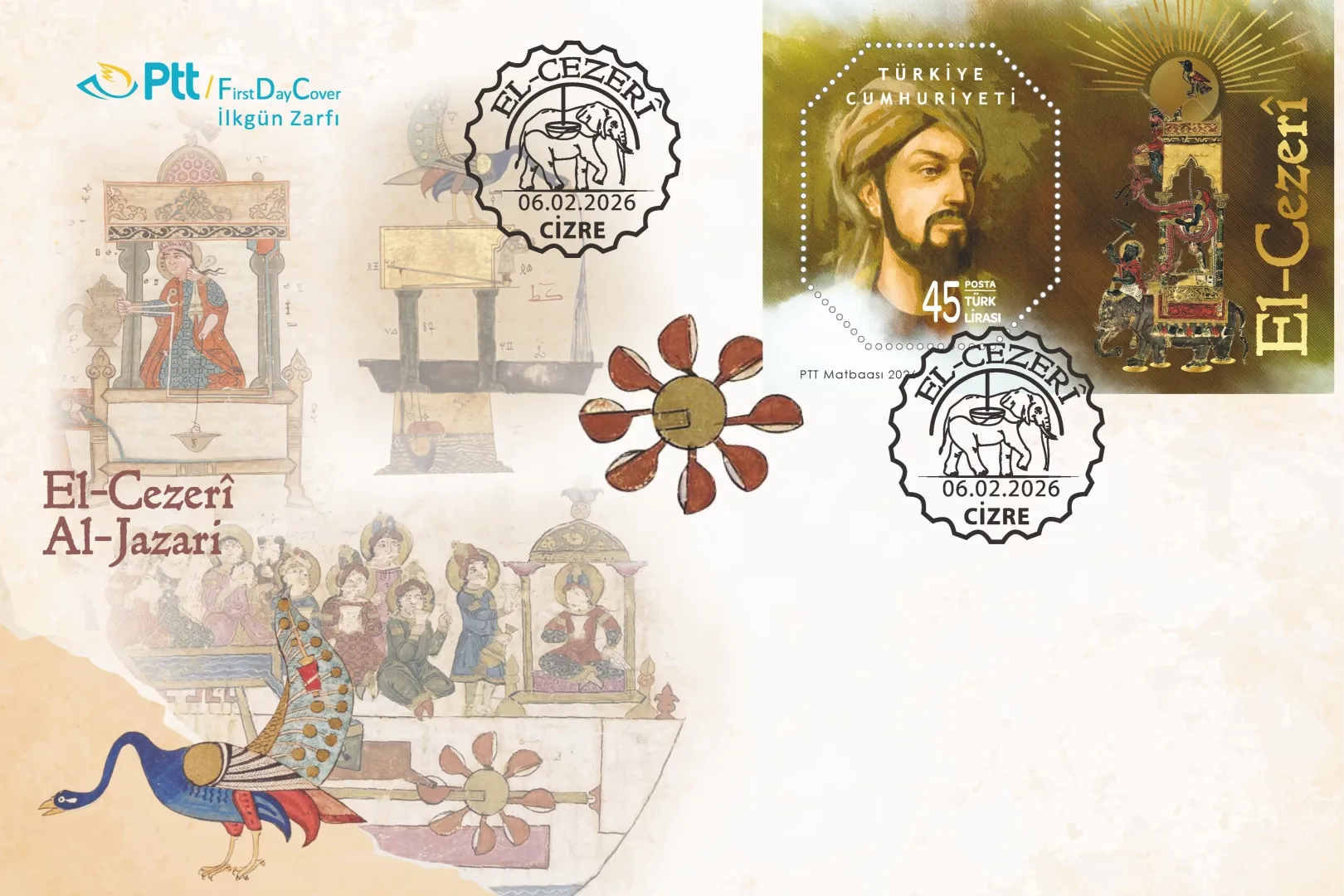 PTT AŞ, El-Cezerî anma pulunu ve ilkgün zarfını tanıttı. 45 TL değerindeki pul ve 90 TL değerindeki zarf, PTT şubelerinde ve online olarak satışa sunuldu.