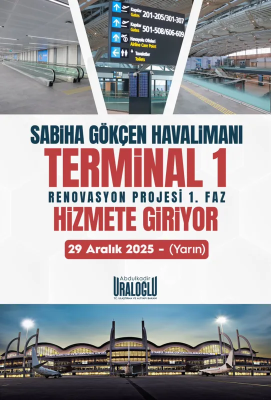 Ulaştırma ve Altyapı Bakanı Abdulkadir Uraloğlu, Sabiha Gökçen Havalimanı Terminal 1 Renovasyon Projesi'nin ilk fazının 29 Aralık Pazartesi günü hizmete açılacağını duyurdu. Proje, yolcu konforunu artıracak ve havalimanının kapasitesini güçlendirecek.