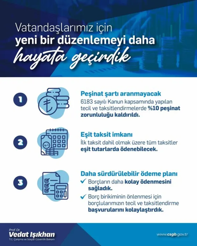 Çalışma ve Sosyal Güvenlik Bakanı Prof. Dr. Vedat Işıkhan, SGK prim borçlarında tecil ve taksitlendirme işlemlerinde önemli bir kolaylık sağlandığını açıkladı.