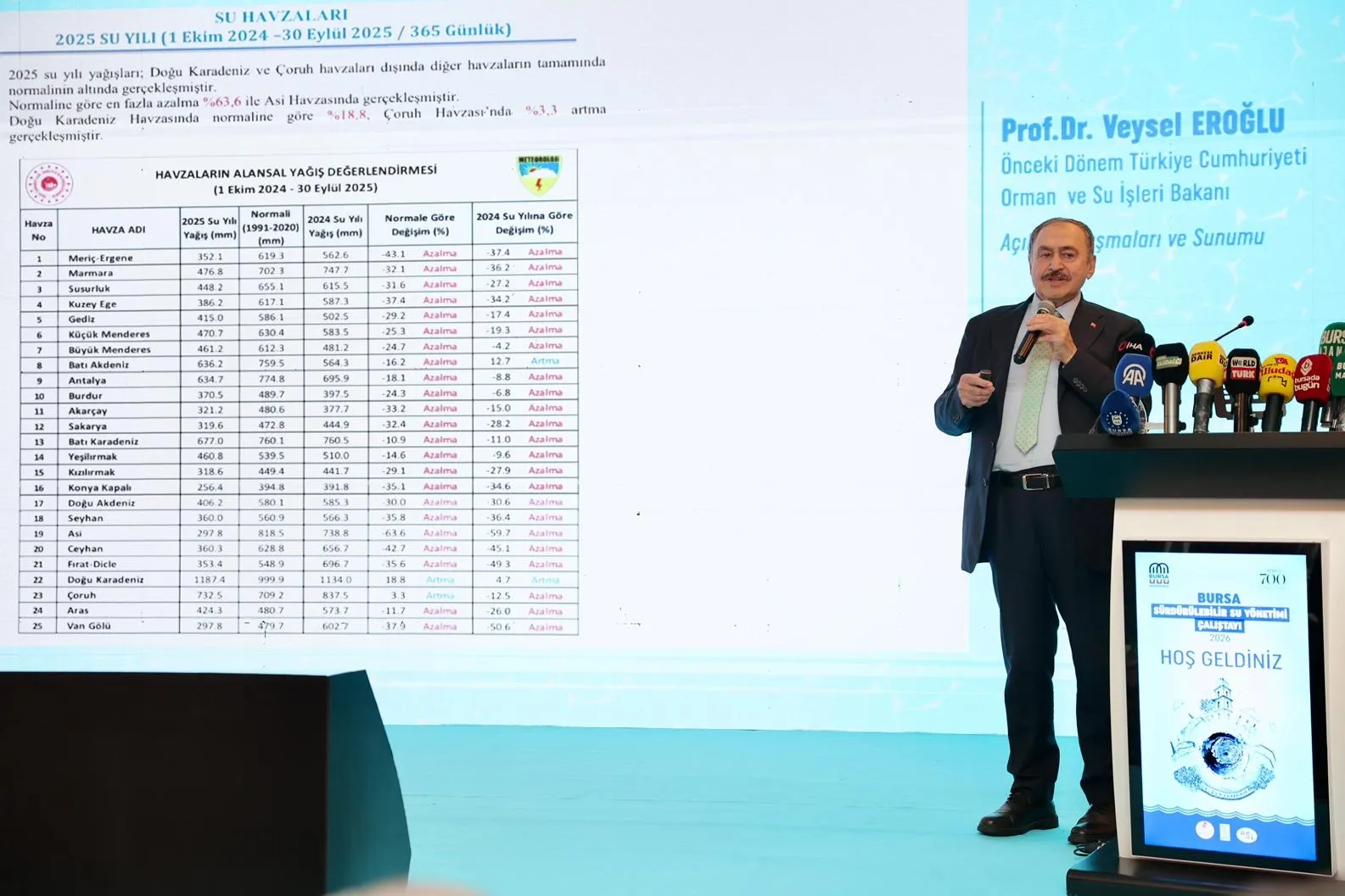 Bursa'yı çok sevdiğini ve şehir ile arasında gönül bağı olduğunu vurgulayan Orman ve Su İşleri eski Bakanı Veysel Eroğlu; "Evet bir iklim değişikliği ile karşı karşıyayız. Ancak doğru planlama yapılırsa ne Bursa'da ne de Türkiye'de herhangi bir su sorunu yaşanmaz. Yeşil Bursa'daki mevcut su yatırımlarının yüzde 90'ı bizim hükümetlerimiz döneminde gerçekleştirilmiştir. Sayın Cumhurbaşkanımızın da Bursa'da projelerin aksamaması için özel talimatı var. Dağdibi, Kocayayla, Ağlaşan Kayacık, Gözede, Yalıçiftlik, Çınarcık, Altıntaş, Karıncalı, Nilüfer, Boğazköy, Çiçeközü, Gökçesu barajları bizim dönemimizde Bursa'ya kazandırıldı. Bakınız 23 yılda Bursa'ya; 25 adet baraj, 12 adet HES, 54 adet sulama tesisi, 4 adet içme suyu tesisi, 27 adet taşkın önleme tesisi ve 5 adet arazi toplulaştırma projesi olmak üzere toplamda 152 adet tesis kazandırdık. Bu tesislerin yatırım maliyeti ise yaklaşık 76 milyar TL. Ancak bu yatırımlara rağmen Bursa'nın yaşadığı sıkıntılar ortada. Yakın vadede bu sorunu aşmak için Çınarcık barajı devreye alınmalıdır. Çınarcık Barajı'ndan su alınıp arıtma tesislerine taşınmalı. Bu su da Bursa'ya verilmelidir. Böylece Bursa'nın su sorunu kalmaz" ifadelerini kullandı.