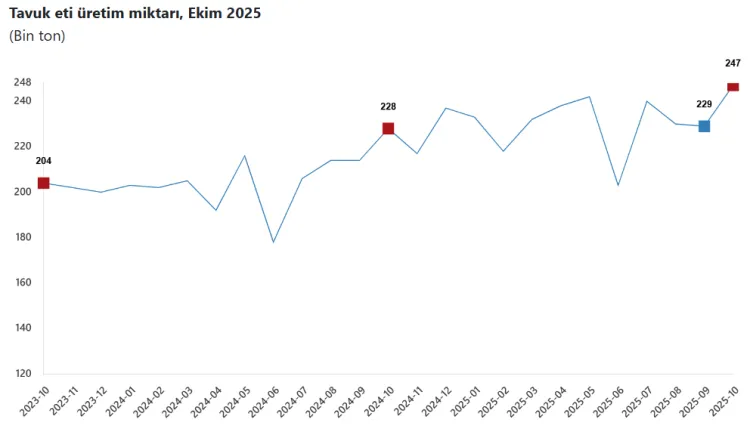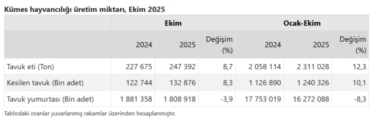 TÜİK verilerine göre, Ekim ayında tavuk eti üretimi 247 bin 392 ton, tavuk yumurtası üretimi ise 1,81 milyar adet olarak gerçekleşti. Tavuk eti üretiminde artış yaşanırken, yumurta üretiminde düşüş dikkat çekti.
