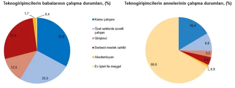 Verilere göre, teknogirişimlerin kurucu ortağı veya en yüksek paya sahip aktif ortaklarının yüzde 87,1'i erkek, yalnızca yüzde 12,9'u kadın girişimcilerden oluşuyor. Kadın girişimcilerde lisansüstü eğitim oranının görece yüksek olması dikkat çekerken, genel olarak kurucu ortakların büyük bölümü lisans ve üzeri eğitim düzeyine sahip.
