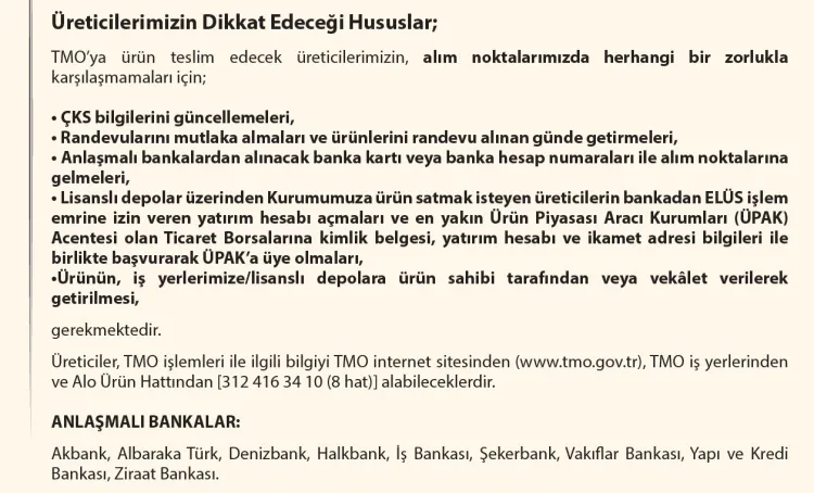 TMO'dan yapılan yazılı açıklamada üreticilerin dikkat etmesi gerektiği hususları da şöyle paylaştı: